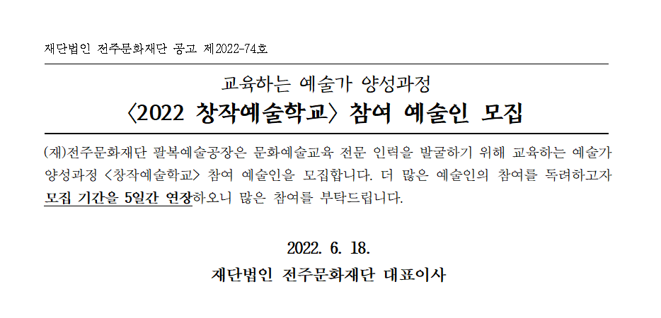 [공고] 교육하는 예술가 양성과정 〈2022 창작예술학교〉 참여 예술인 모집 공고 (모집기간 연장: ~6. 22.)