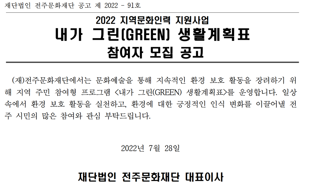 [공고] 2022 지역문화인력 지원사업 '내가 그린(GREEN) 생활계획표' 참여자 모집 공고