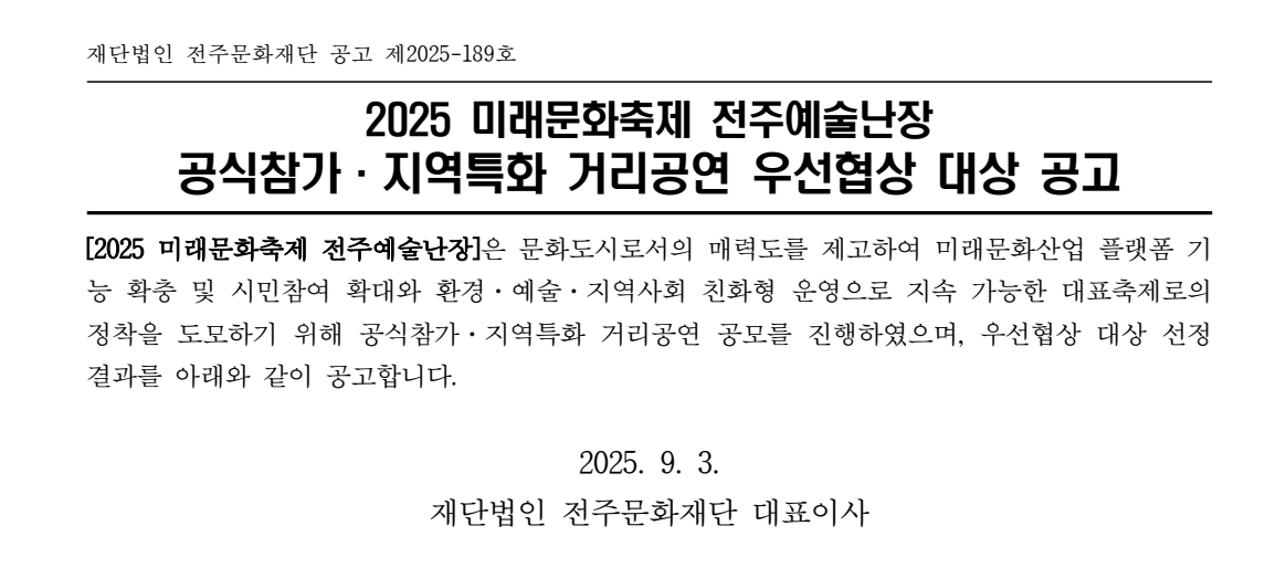 [공고] 2025 미래문화축제 전주예술난장 공식참가·지역특화 거리공연 우선협상 대상 공고