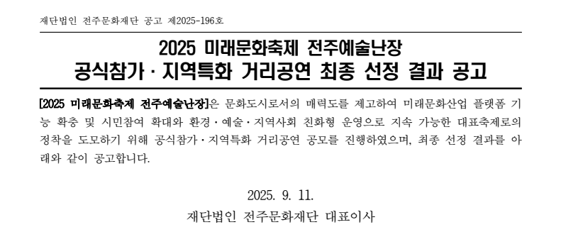 [공고] 2025 전주예술난장 공식참가‧지역특화 거리공연 최종 선정 결과 공고