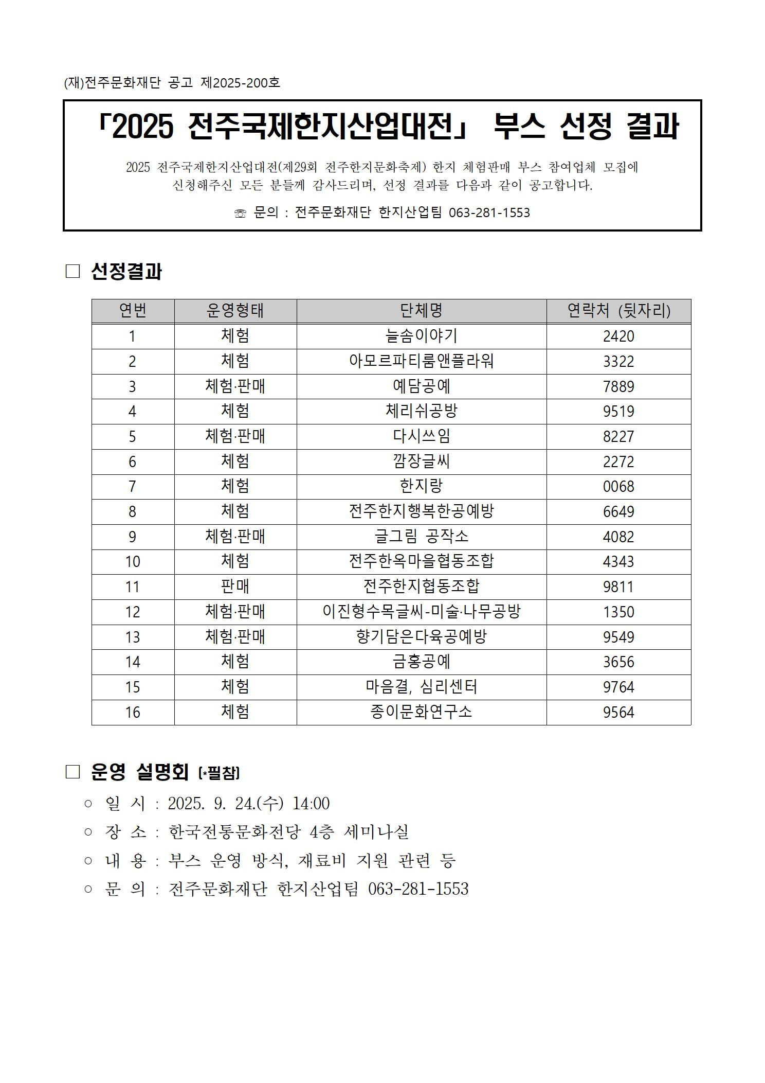 공고문 (2025 전주국제한지산업대전 '한지 체험판매 부스 선정 결과).pdf
