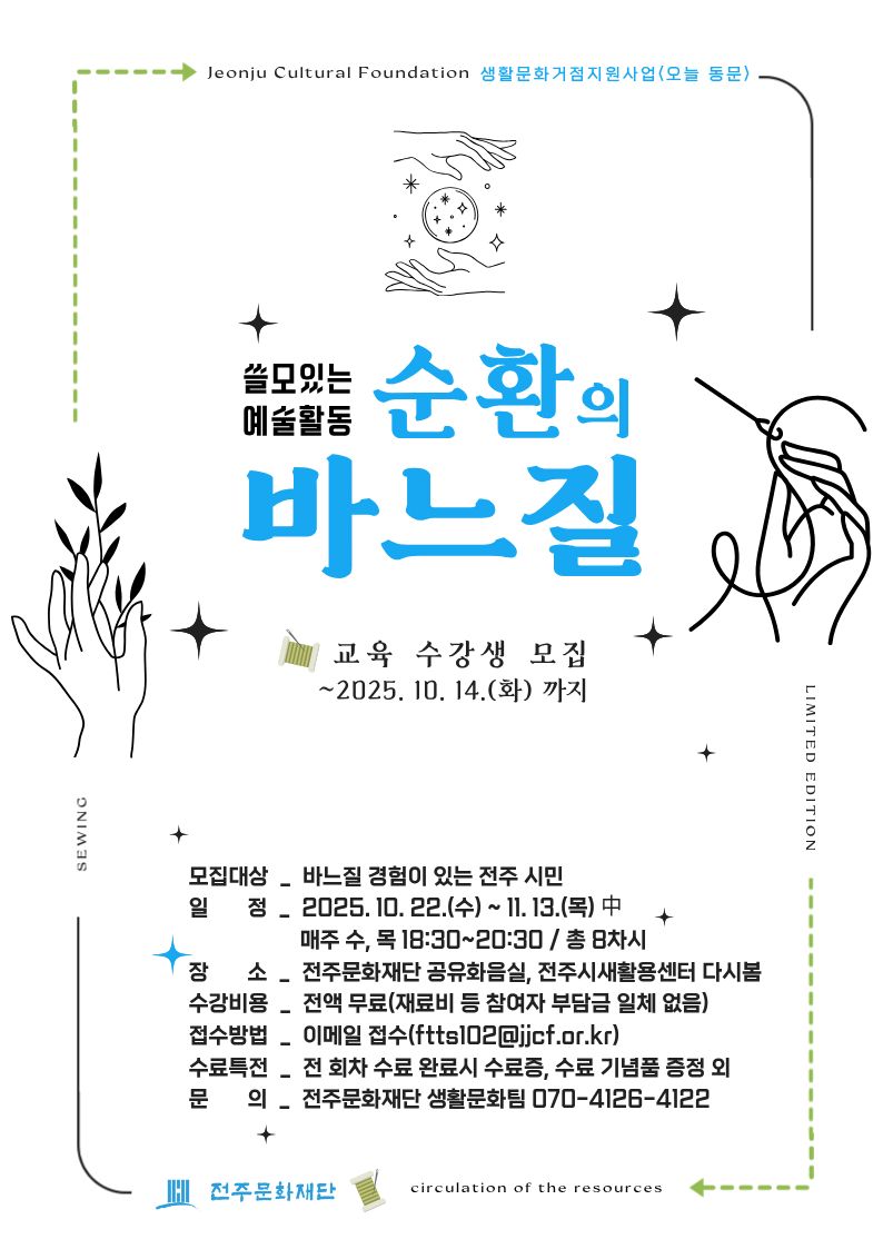 [마감] 생활문화거점 지원사업<오늘 동문>'쓸모있는 예술활동-순환의 바느질’ 수강자 모집 공고