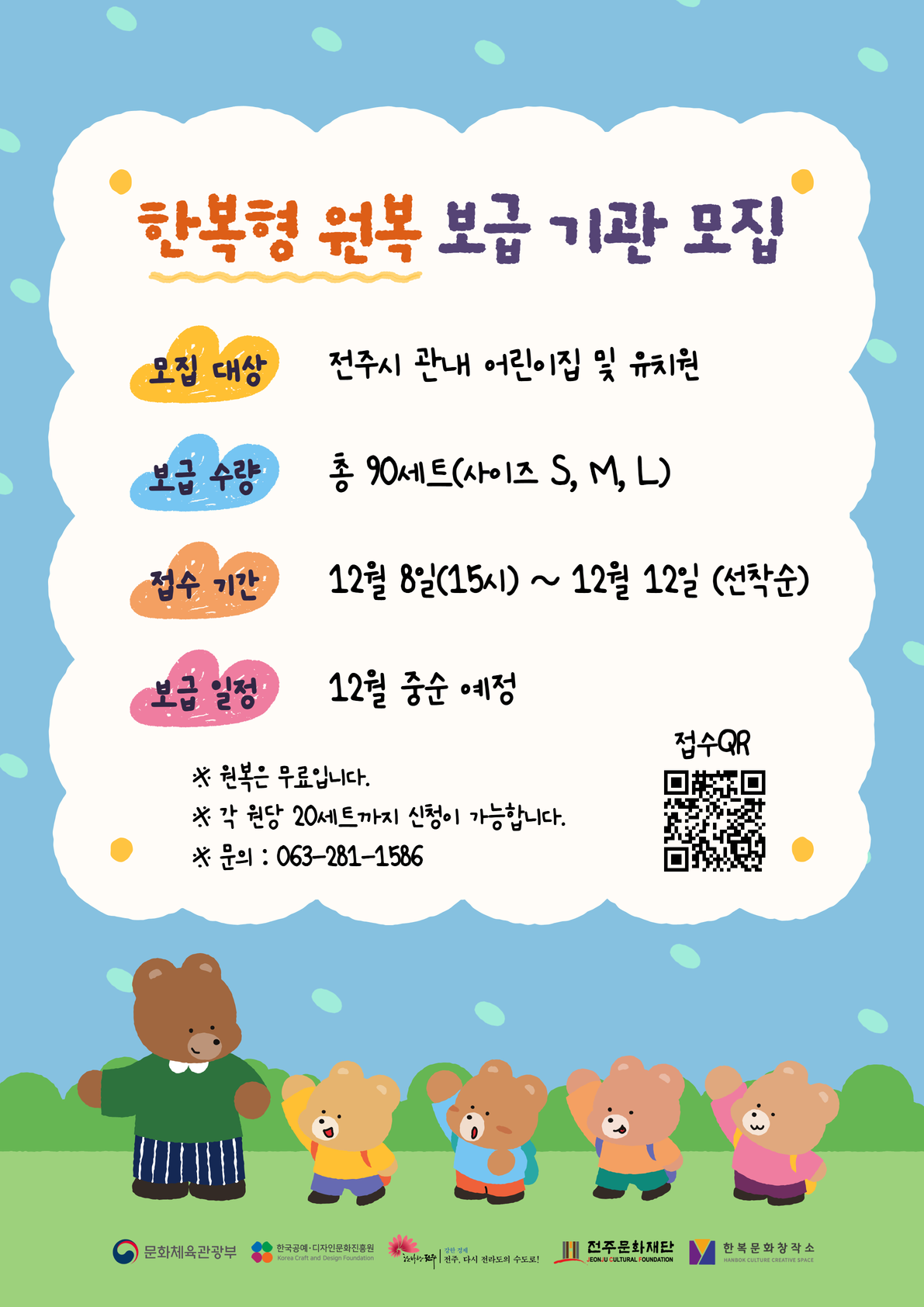 전통의 아름다움을 일상에서 자연스럽게 경험할 수 있도록, 전주한복문화창작소가 우리 아이들의 하루에 ‘전통의 색’을 더해줄 한복형 원복을 무료로 보급합니다. 각 원당 최대 20세트까지 신청 가능하니 많은 관심 부탁드립니다.