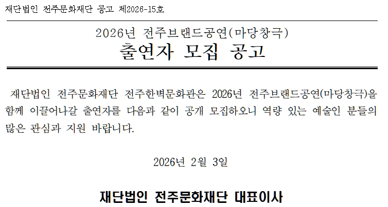 [공고] 2026년 전주브랜드공연(마당창극) 출연자 모집 공고