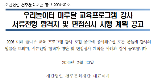 2026 우리놀이터 마루달 교육프로그램 강사 서류합격자 및 면접심사 시행 계획 공고