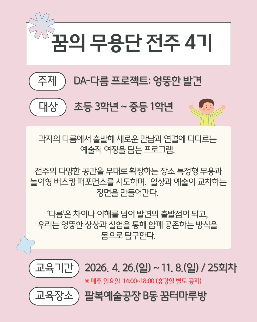 함께 웃고, 함께 움직이며, 함께 성장하는 예술 여행에 초대합니다.