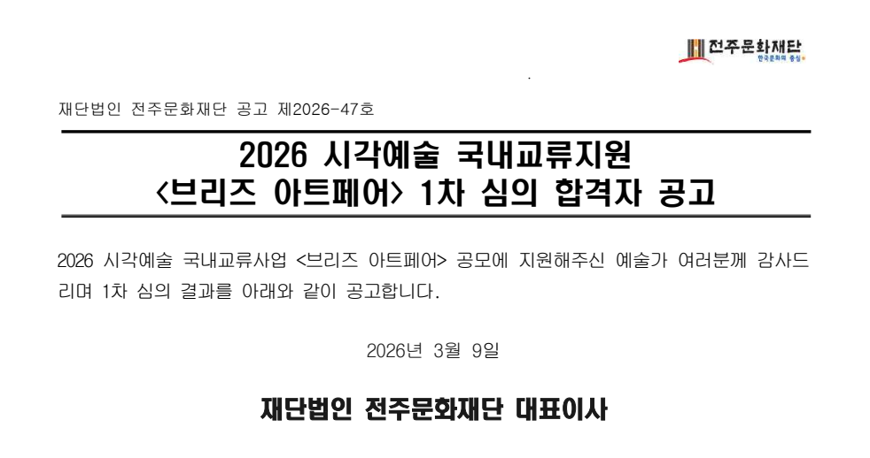 [공고] 2026 시각예술 국내교류지원 <브리즈 아트페어> 1차 심의 합격자 공고