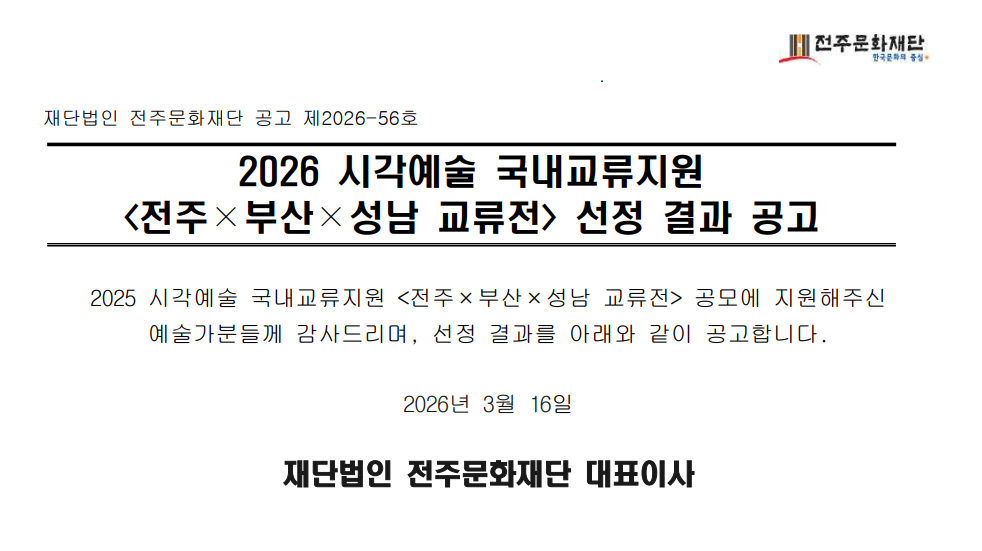 [공고] 2026 시각예술 국내교류지원 '전주×부산×성남 교류전' 선정 결과 공고