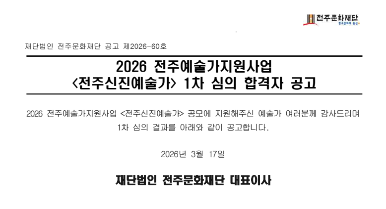 [공고] 2026 전주예술가지원사업 '전주신진예술가' 1차 심의 결과 공고