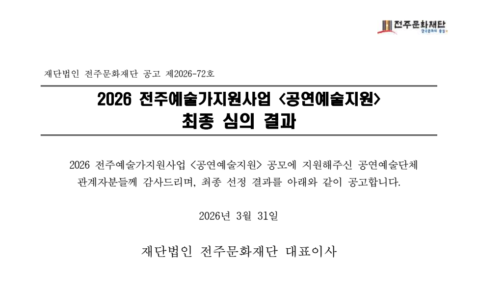 2026 전주예술가지원사업 '공연예술지원' 최종 심의 결과