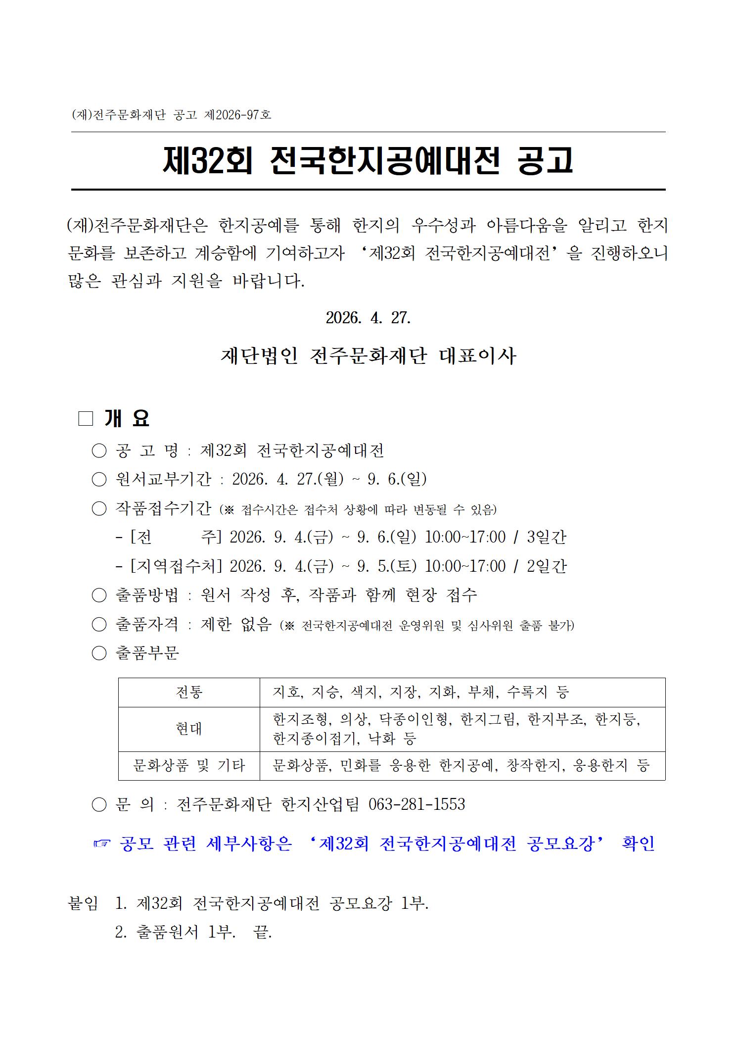 [공고] '제32회 전국한지공예대전' 원서교부 및 모집요강 공고