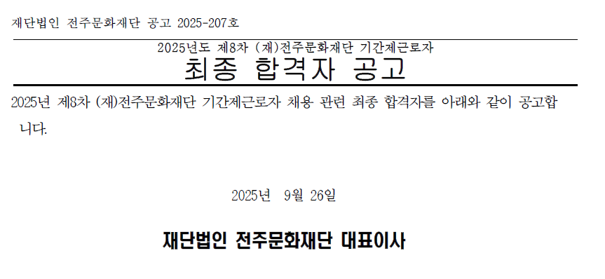 2025년도 제8차 (재)전주문화재단 기간제근로자 최종 합격자 공고