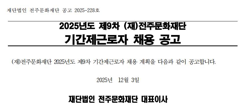2025년도 제9차 (재)전주문화재단 기간제근로자 채용 공고