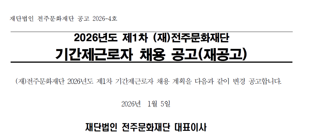 2026년도 제1차 (재)전주문화재단 기간제근로자 채용 공고(재공고)
