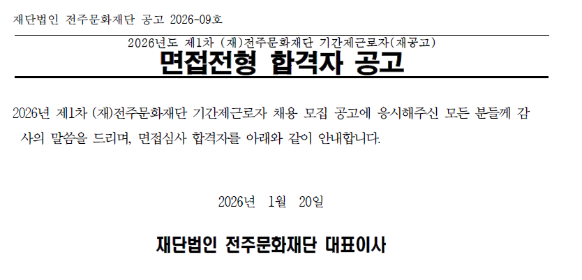 2026년도 제1차 (재)전주문화재단 기간제근로자(재공고) 면접전형 합격자 공고