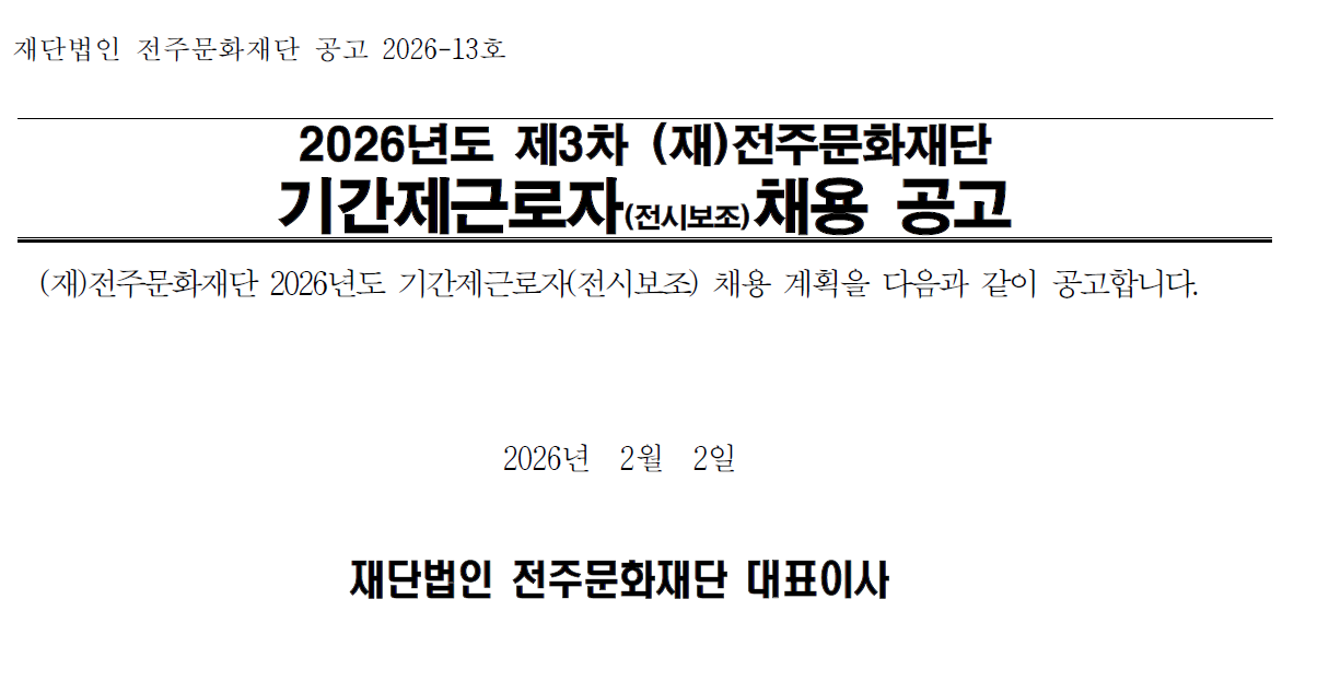 2026년도 제3차 (재)전주문화재단 기간제근로자(전시보조)채용 공고