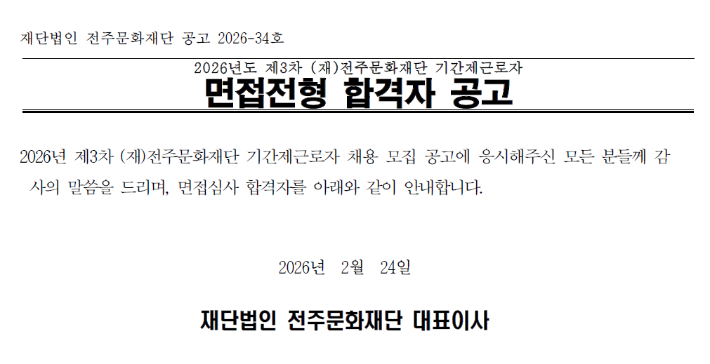 2026년도 제3차 (재)전주문화재단 기간제근로자 면접전형 합격자 공고