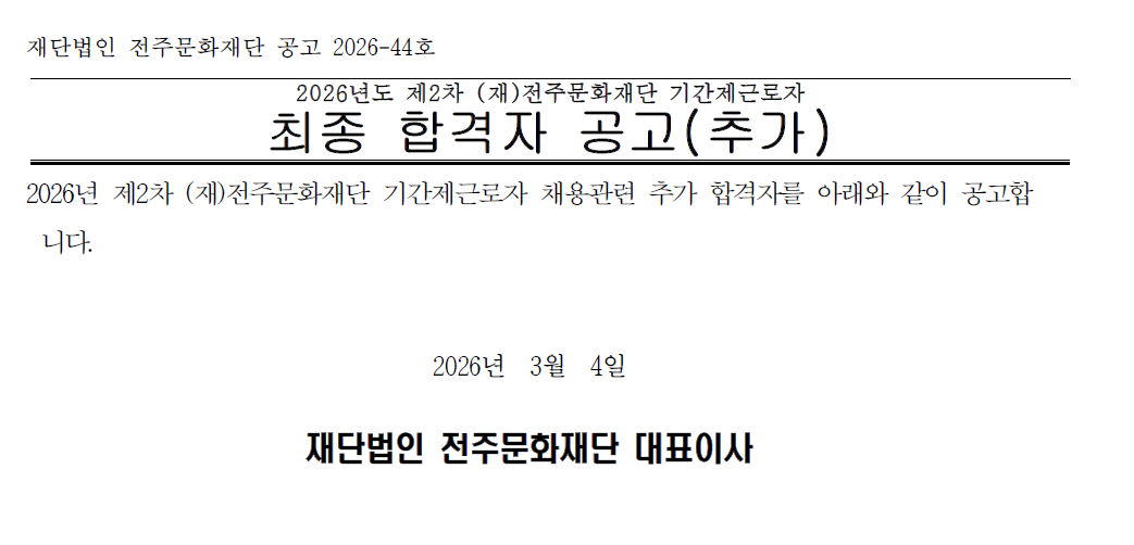 2026년도 제2차 (재)전주문화재단 기간제근로자 최종 합격자 공고(추가)