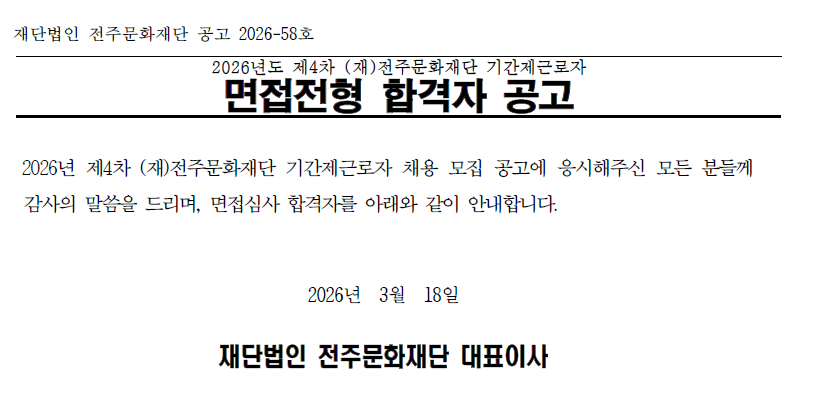 2026년도 제4차 (재)전주문화재단 기간제근로자 면접전형 합격자 공고