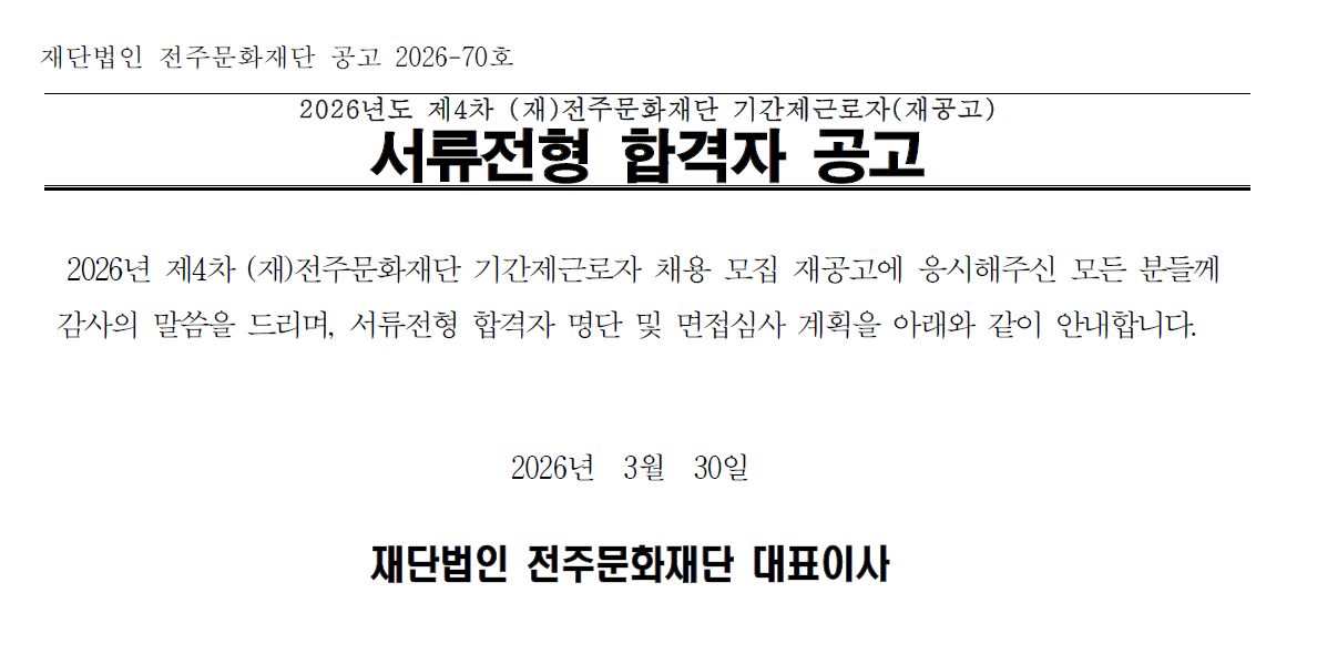 2026년도 제4차 (재)전주문화재단 기간제근로자(재공고) 서류전형 합격자 공고