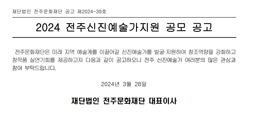 [공고] 2024 전주 신진예술가 지원사업 공모 공고
