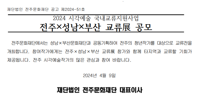 [공고] 2024 시각예술 국내교류지원사업 전주×성남×부산 교류展 공모 공고