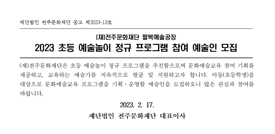 [공고] 2023 초등 예술놀이 정규 프로그램 참여 예술인 모집(~3.3)