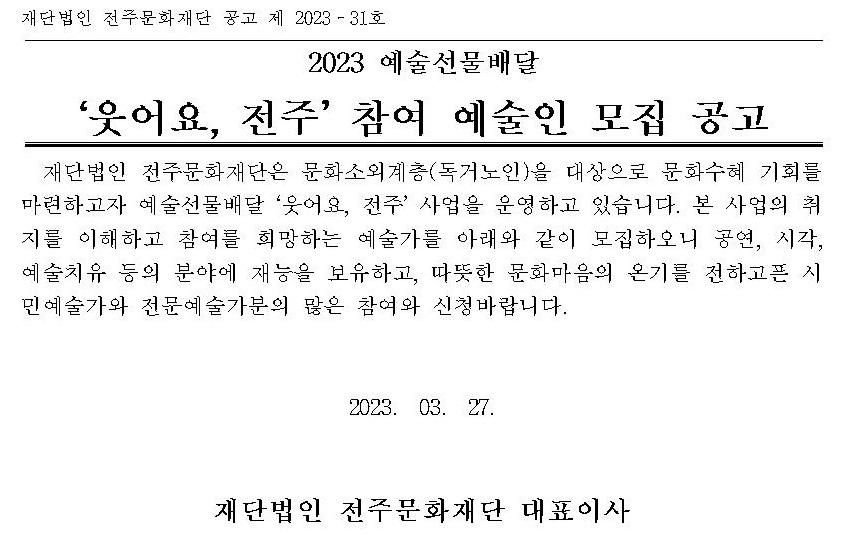 [공고] 2023 전주문화재단 '웃어요, 전주' 참여 예술인 모집 공고