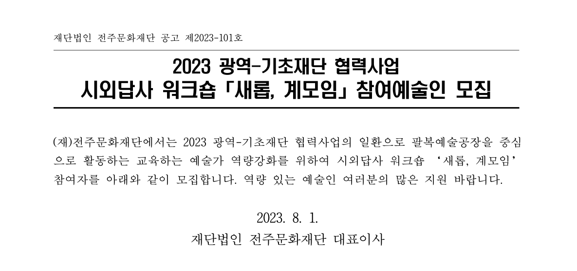 [모집] 2023 광역-기초재단 협력사업 시외답사 워크숍 「새롭, 계모임」 참여예술인 모집