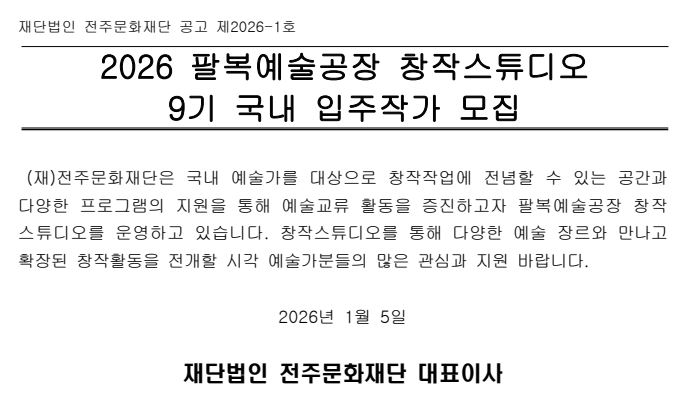 [공고] 2026 팔복예술공장 창작스튜디오 9기 국내 정기 입주작가 모집공고