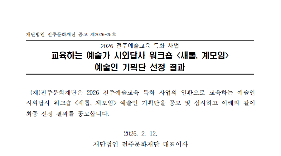 [공고] 2026 교육하는 예술가 시외답사 워크숍 예술인 기획단 선정 결과