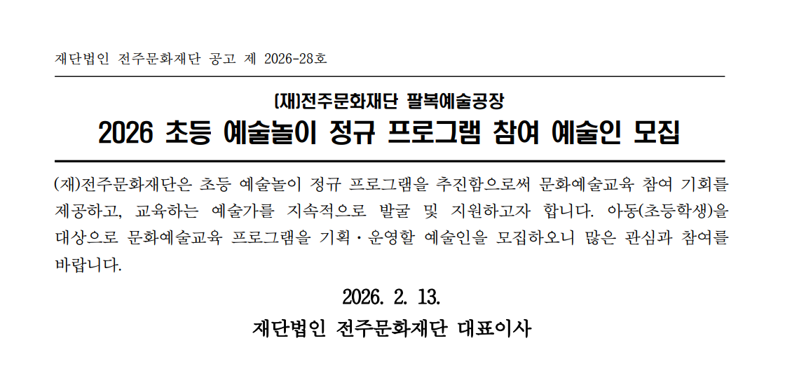 [공고] 2026 초등 예술놀이 정규 프로그램 참여 예술인 모집