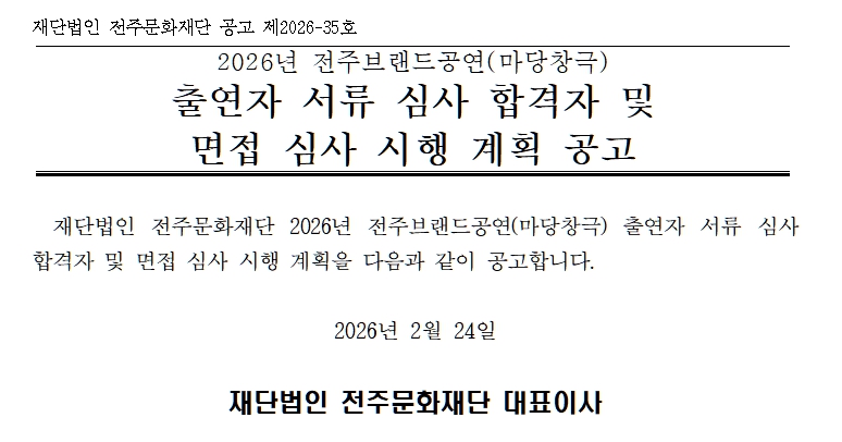2026년 전주브랜드공연(마당창극) 출연자 서류 심사 합격자 및 면접 심사 시행 계획 공고
