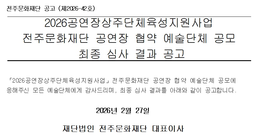 [공고] 2026공연장상주단체육성지원사업 전주문화재단 공연장 협약 예술단체 최종 심사 결과 공고