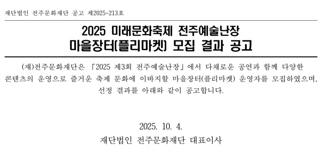 [공고] 2025 미래문화축제 전주예술난장 마을장터(플리마켓) 모집 결과