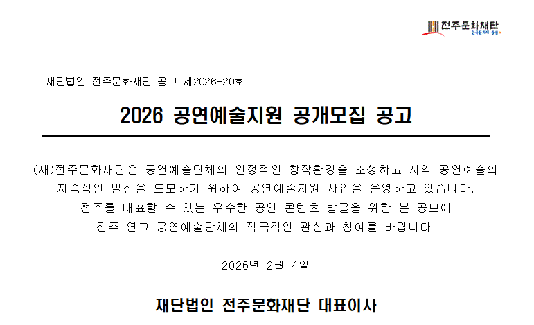 [공고] 2026 전주신진예술가지원 공개모집 공고
