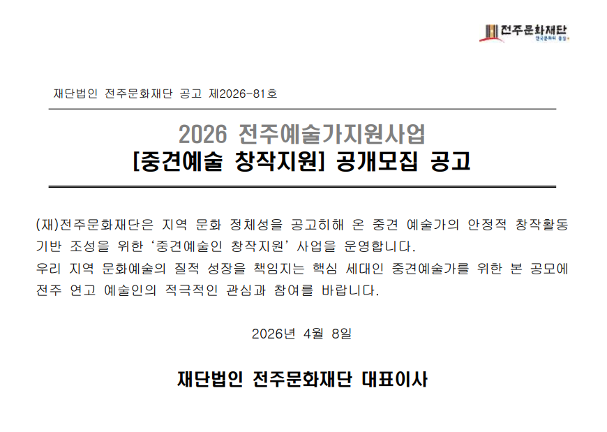 2026 전주예술가지원사업 [중견예술 창작지원] 공개모집 공고