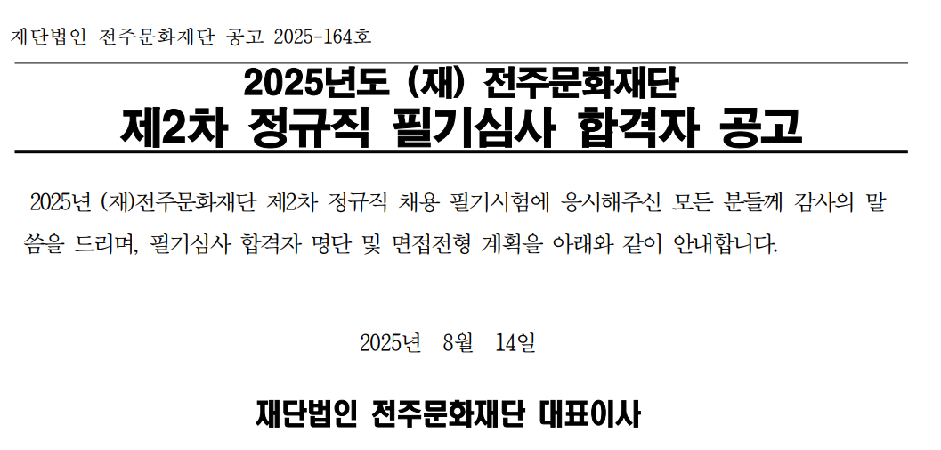 2025년도 (재) 전주문화재단 제2차 정규직 필기심사 합격자 공고