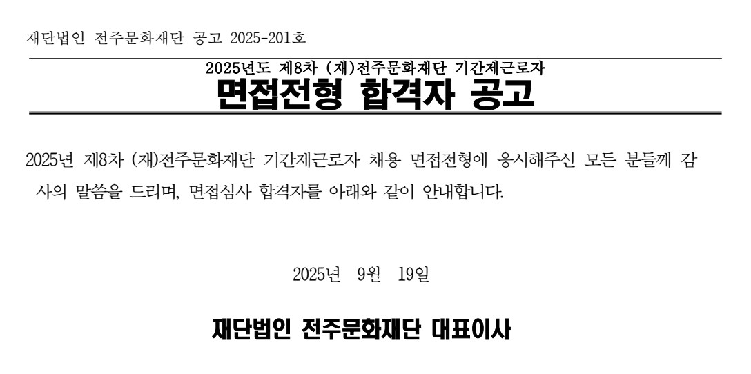 2025년도 제8차 (재)전주문화재단 기간제근로자 면접전형 합격자 공고