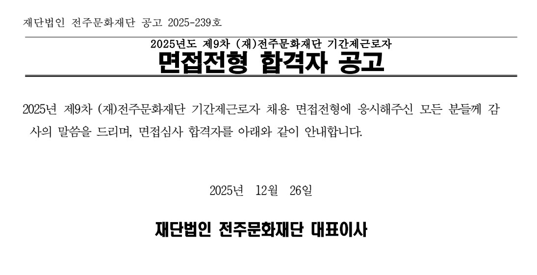 2025년도 제9차 (재)전주문화재단 기간제근로자 면접전형 합격자 공고