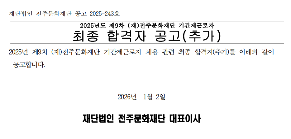 2025년도 제9차 (재)전주문화재단 기간제근로자 최종 합격자 공고(추가)