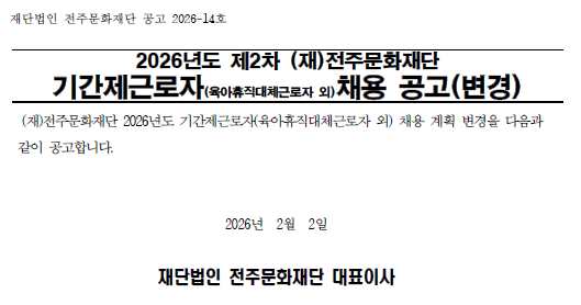 2026년도 제2차 (재)전주문화재단 기간제근로자(육아휴직대체근로자 외)채용 공고