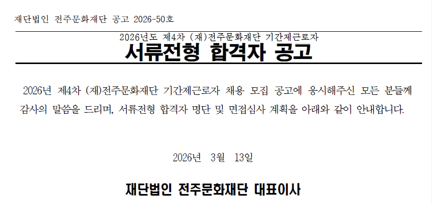 2026년도 제4차 (재)전주문화재단 기간제근로자 서류전형 합격자 공고