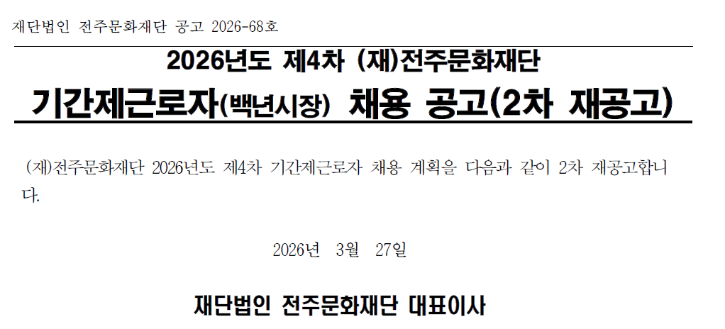 2026년도 제4차 (재)전주문화재단 기간제근로자(백년시장) 채용 공고(2차 재공고)