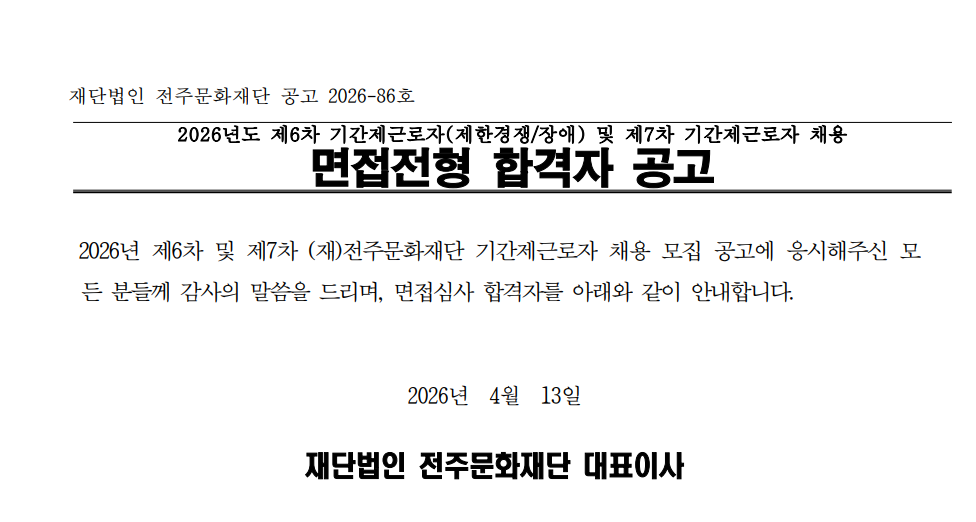 2026년도 제6차 기간제근로자(제한경쟁/장애) 및 제7차 기간제근로자 채용 면접전형 합격자 공고